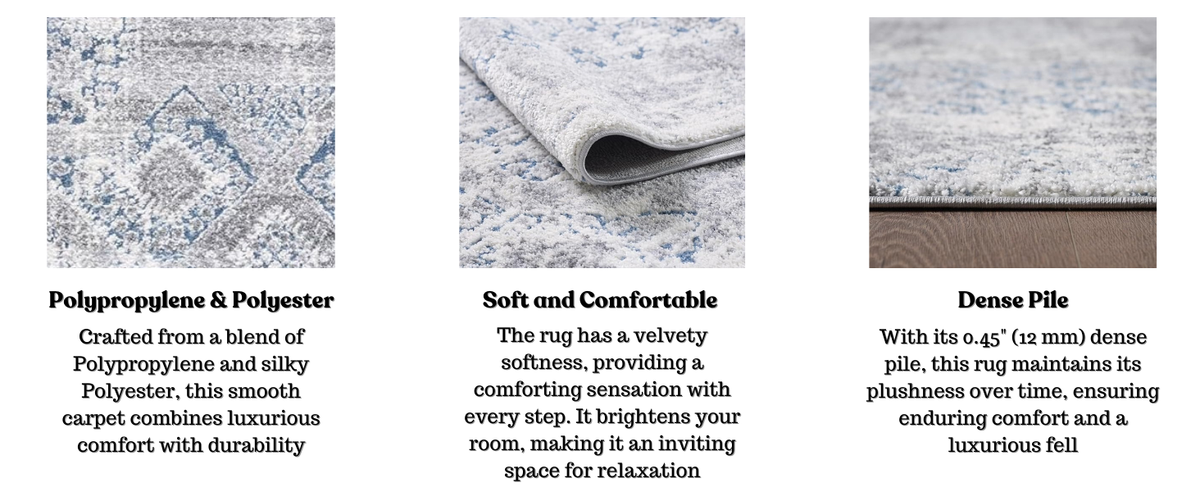 - Premium Materials: Made from 70% premium Polypropylene and 30% silky Polyester, this blue & grey color carpet offers both durability and a soft, comfortable feel beneath your feet. The combination of these materials ensures the rug maintains its plush texture over time.