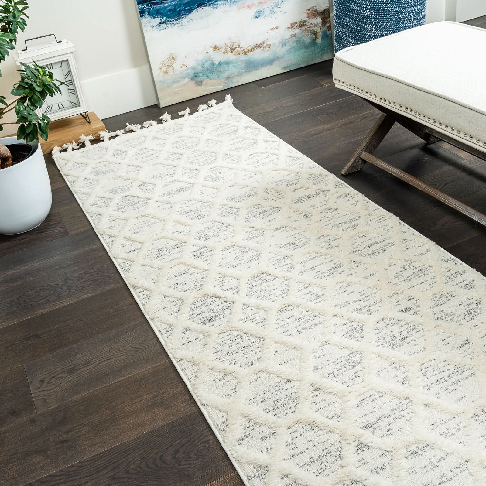 • EXQUISITE MOROCCAN DESIGN: Machine-made with precision, this trellis lines rugs features an elegant off-white and grey Moroccan lattice pattern complemented by fringe tassels. The intricate design and advanced weaving technique enhance the rug's texture and add a sophisticated touch to any room, making it a standout piece in your living space.