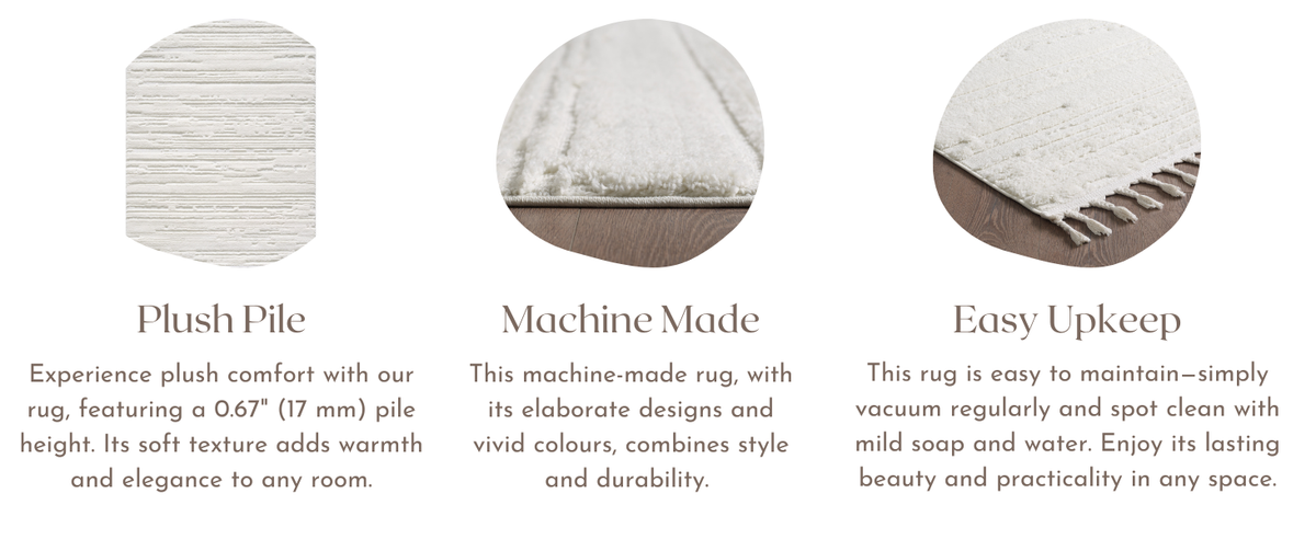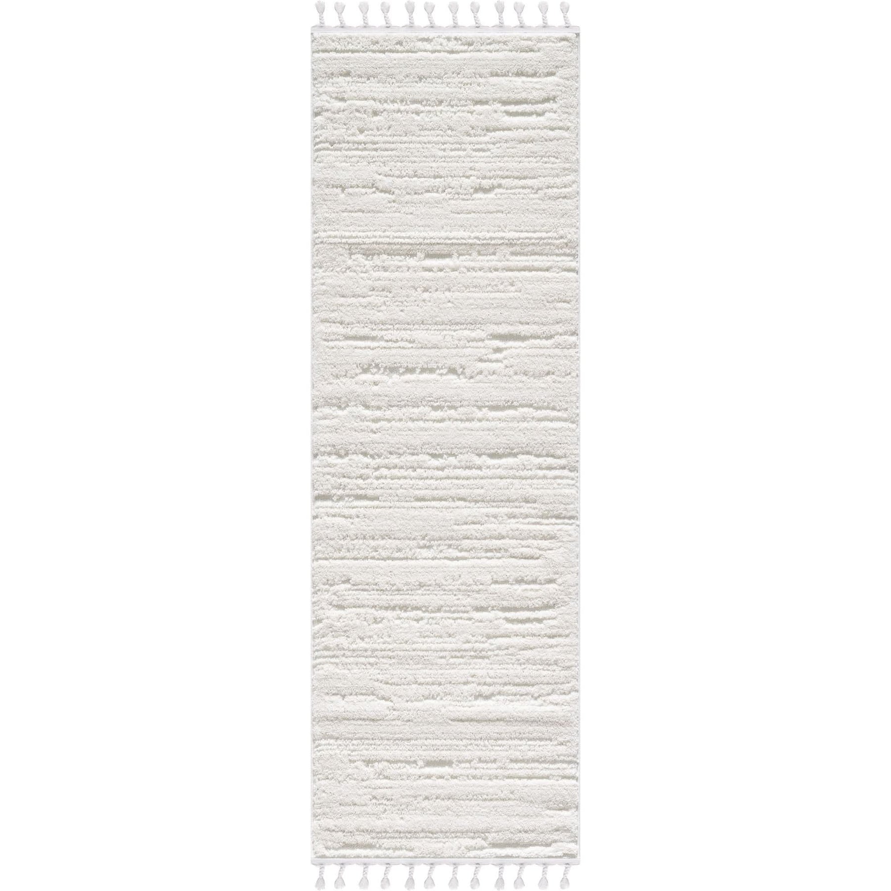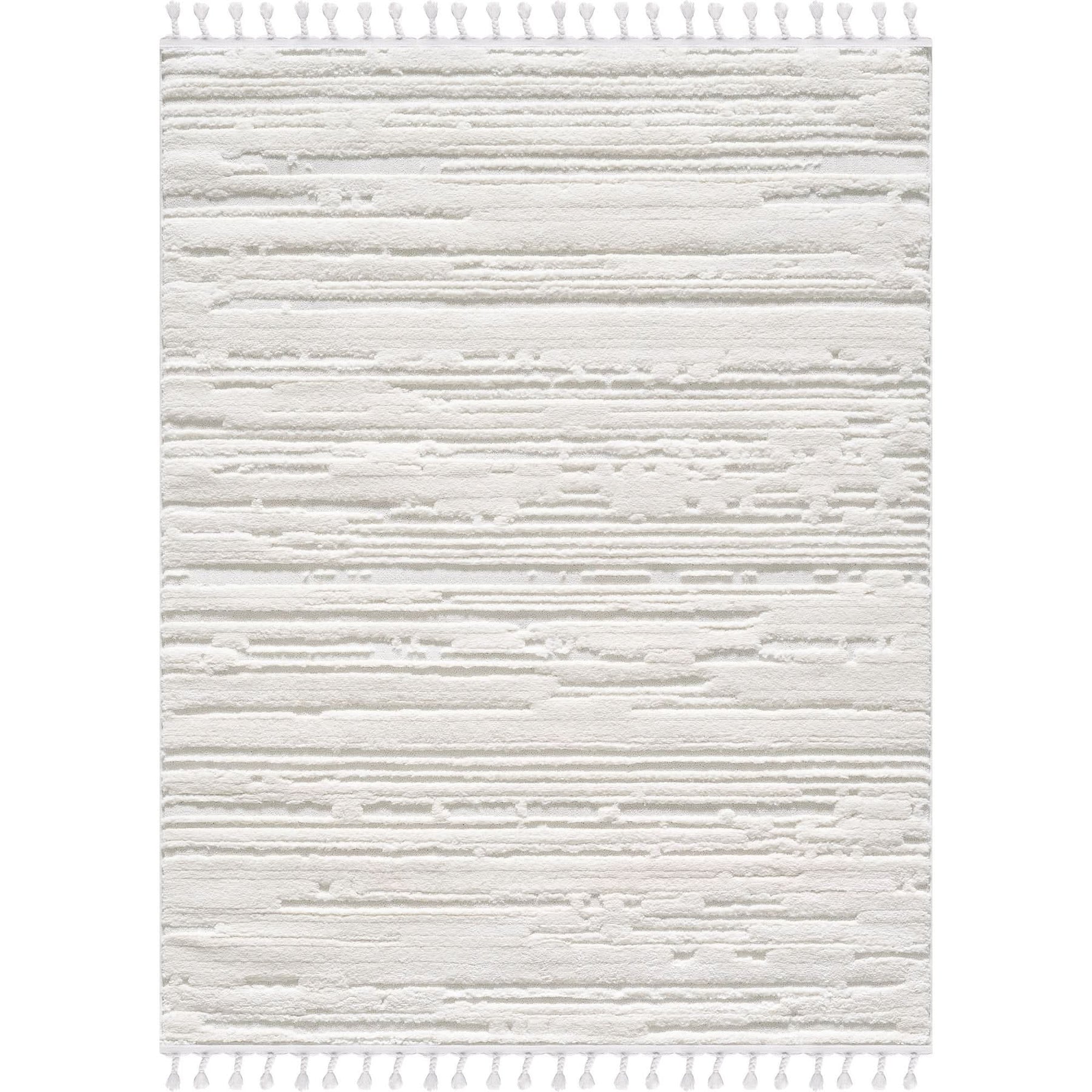 This beautiful area rug combines elegance, comfort, and durability. Made from 100% premium polypropylene, it offers a soft and luxurious feel underfoot. With a 0.67-inch high/low soft dense pile, this rug provides plush comfort and retains its texture over time. Its stain-resistant properties make it easy to maintain, ideal for high-traffic areas. The machine-made construction with a jute backing ensures stability and longevity. The beautiful ombre lines design in a neutral light cream color, complemented by captivating tassels, adds a touch of luxury to any room. Whether as a stunning centrepiece for the living room, a cozy nursery rug for the bedroom, or an elegant addition to the hallway, this off white fluffy carpet is a versatile and stylish choice for your home.
