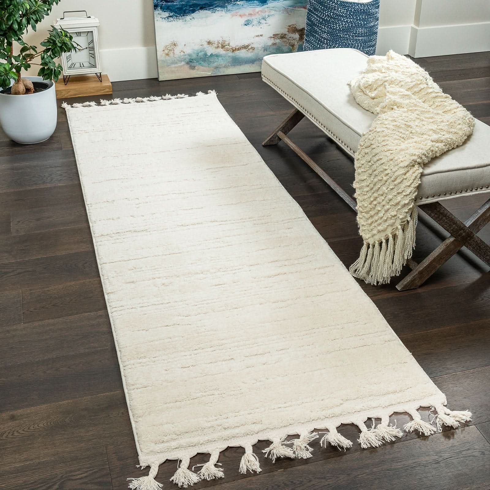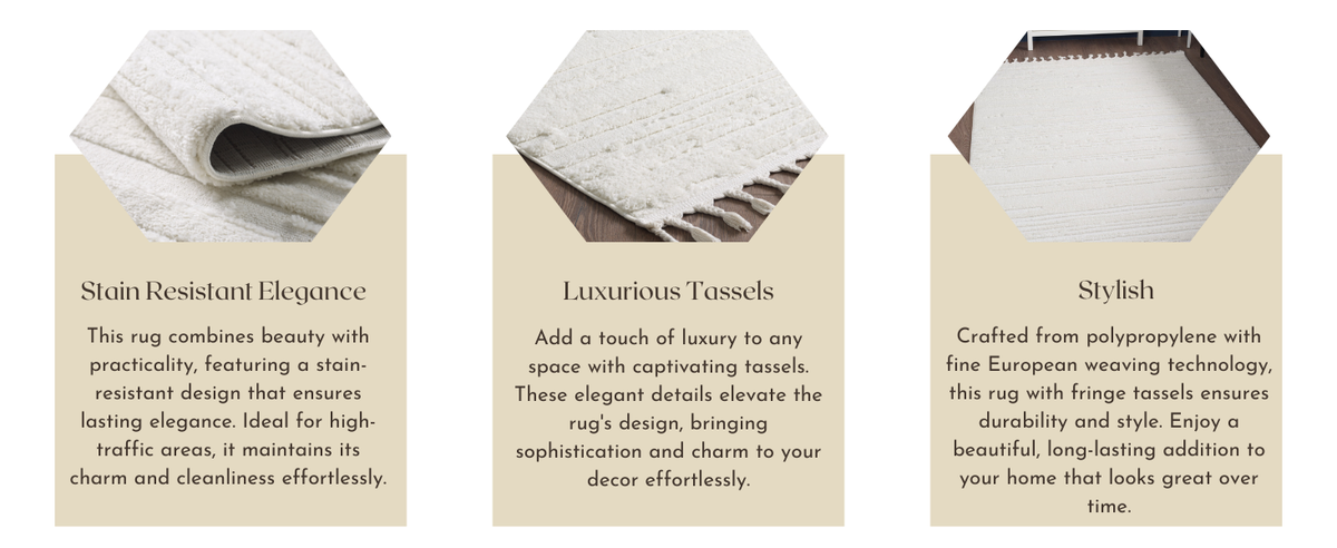 - MACHINE MADE CONSTRUCTION: The machine-made construction ensures a uniform and consistent design, providing a high-quality finish. This cream rug with fringe tassels features a sturdy jute backing that adds stability and durability, ensuring it stays in place and lasts for years.