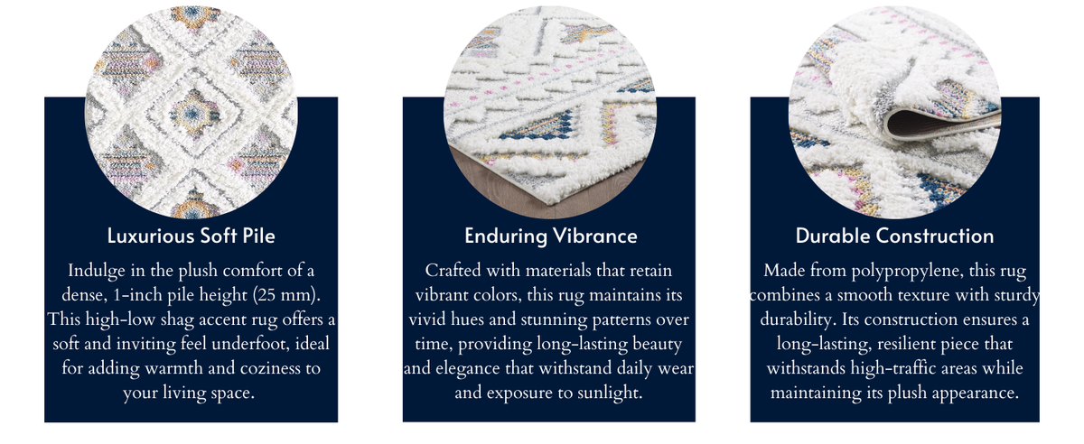 Transform your living space with the AG Home Moroccan shag accent rug. This stunning shag rug features a captivating Bohemian diamond design in a mixed off-white and multicolor cut-loop pile, making it a versatile and stylish addition to any room. The rug is crafted from 100% premium polypropylene, ensuring long-lasting durability and a soft feel underfoot. With a plush 1.18" (30 mm) high/low pile, this contemporary bohemian carpet provides exceptional comfort and coziness, perfect for areas where you spend a lot of time on your feet. The fine European weaving technology used in its machine-made construction guarantees consistent quality and a beautiful finish that will endure daily use.