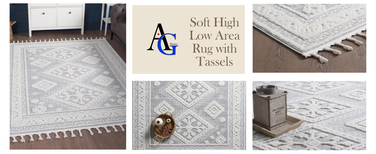 The AG Home area rug is the epitome of elegance, comfort, and durability. Crafted from 100% premium polypropylene, this contemporary area rug offers a soft and luxurious feel underfoot. Its 0.67-inch high/low dense pile ensures plush comfort and retains its inviting texture over time. With its stain-resistant properties, the rug is easy to maintain, making it ideal for high-traffic areas. The machine-made construction with a jute backing ensures stability and longevity. Featuring a beautiful medallion geometric design in neutral light cream and grey, complemented by captivating tassels, this rug with fringe tassels adds a touch of luxury to any room. Whether as a stunning centrepiece for the living room, a cozy nursery rug for the bedroom, or an elegant addition to the hallway, this versatile and stylish rug is a perfect choice for your home decor.