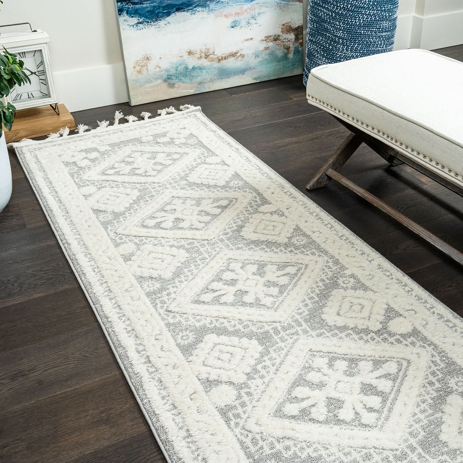 - MACHINE MADE: This diamond pattern rug is machine-made, ensuring a consistent and high-quality finish. sturdy jute backing adds stability and durability, ensuring the rug remains in place and lasts for years.