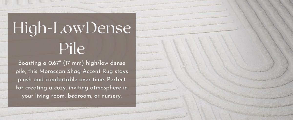 • Comfortable Pile: Boasting a 0.67" (17 mm) high/low dense pile, this off-white fluffy carpet provides a plush and sufficient surface that remains soft over time. The thick pile offers a cozy and inviting feel, perfect for lounging, relaxing, or playing. It also helps to reduce noise and offers added insulation, contributing to a warmer and more peaceful environment.