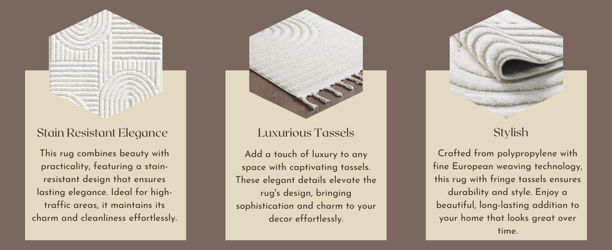 • Easy to Maintain: Designed for easy maintenance, this rug with fringe tassels is stain-resistant and simple to clean. Regular vacuuming without the beater prevents dust and dirt from settling deep into the pile, while spot cleaning with mild soap and water removes stains. For best results, professional cleaning is recommended.